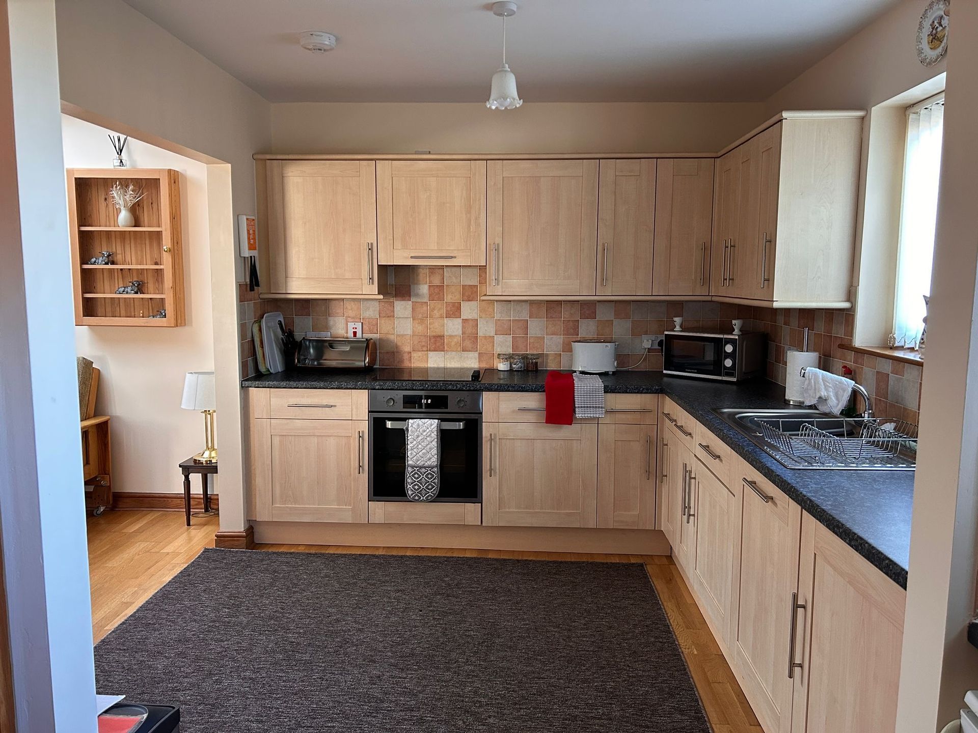Peace Cottage features a living room with electric wood-burner, wooden floor and French doors to a large kitchen with wooden floor. One double bedroom and one twin bedroom. Bathroom with over-bath shower and toilet.